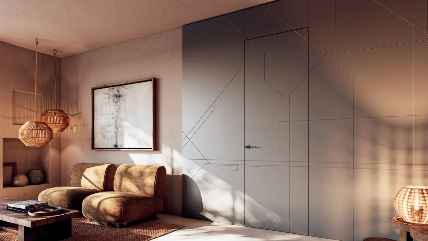 Porta Filomuro: Si integra completamente nella parete, eliminando cornici e cerniere a vista, per un effetto minimalista di grande impatto.